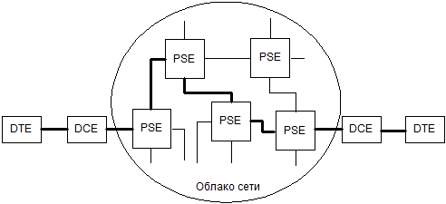 DTE получают доступ к сетевым ресурсам через PSE. PSE и структура их связей образуют "облако" (топологию) сети, они выполняют процедуры создания виртуальных каналов, передают пакеты по действующим виртуальным каналам. Виртуальные каналы в X.25 называют логическими каналами. Каждый физический канал в PSE поддерживает несколько логических каналов, каждый PSE в любом из своих портов поддерживает множество логических каналов.