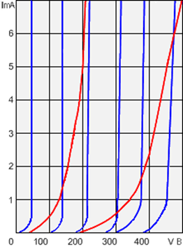 Рис. 1. Вольт-амперні характеристики варисторів: сині — на основі ZnO, червоні — на основе SiC.