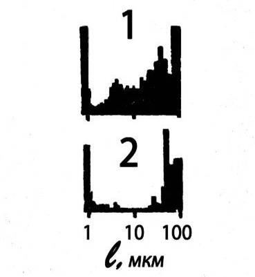 Рис.1.1. Розподіл часток ZnO по розміру до (1) та після ультразвукової обробки (f = 40кГц, звукова потужність 110 Вт) на протязі двох хвилин (2)
