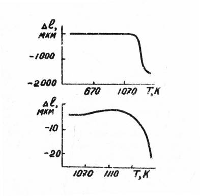 При нагріванні заготовки до температур 670-770 К виникає твердо фазна взаємодія ZnO і Bi2 O3 зі створенням фази ZnO. 24 Bi2 O3, на формування йде весь оксид вісмуту низькотемпературної α – модифікації. В області температур 920 – 970 К, завдяки реакціям в твердому стані, створюється фаза з структурою шпінелі Zn7 Bi3 Sb3 O14 [42]. В області температур 1170 К виникає перехід Co3 O4 виділенням кисню в стійкий при високих температурах оксид CoO, де кобальт знаходиться в двовалентному стані. В результаті цього кобальт починає інтенсивно розчинятися в решітці оксиду цинку. Цей процес відповідний за створення глибоких рівнів в оксиді цинку і зелене забарвлення готової кераміки. В цій же області температур проходить плавлення фази с структурою пирохлора, ідентифікуєме методом високотемпературної рентгенівської дифракції. Поява рідкої фази інтенсифікує процес усадки (ущільнення) заготовки. Для ілюстрації цього процесу на рис.1.2 приведені результати дилатометрії спікаємої заготовки, показуючи різке зменшення лінійних розмірів спікаємої заготовки в вузькому температурному інтервалі.