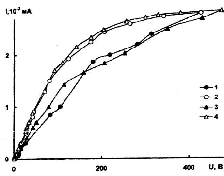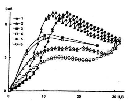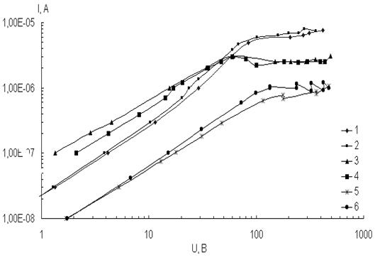 Напруга фіксується на протязі 30с. криві (1 і2), а також вимірюється спочатку і вкінці кожного такого інтервалу. Криві 3 і 4 (зняті після кривих 1 і 2) – встановлене значення струму через 600 с. після подачі фіксованої напруги на зразок. Для ясності точки, отримані в хронологічному порядку, з’єднані лінією. Криві 5 і 6 отримані після регістрації струму, відповідаю чому кривим 3 і 4.