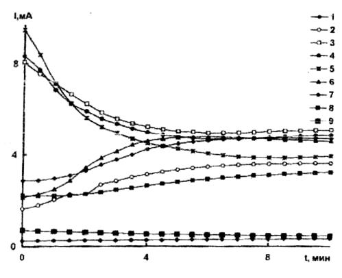 Рис.3.3. Залежність струму від часу при фіксованих значеннях напруги, подаваємої на зразок в такій послідовності, В: 1-1; 2-5; 3-10; 4-15; 5-25; 6-15; 7-10; 8-5; 9-1
