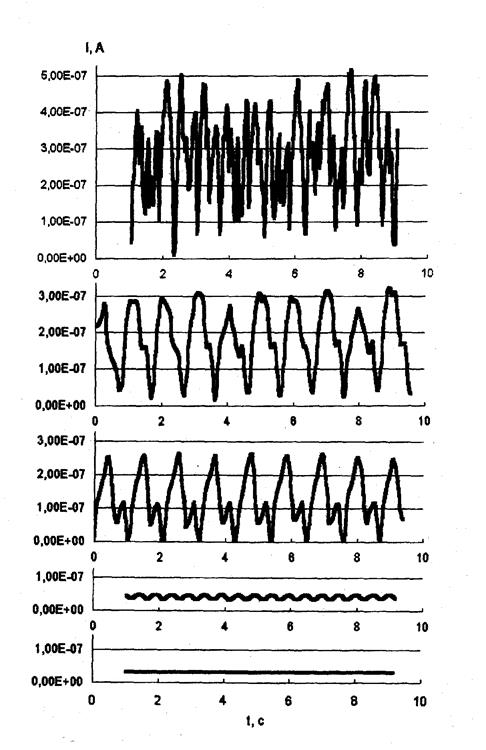 Для більш докладного дослідження коливань струму були зняті часові залежності струму I=I(t) для різних значень постійної напруги. Часові залежності було зареєстровано фотографуванням, з 10 секундною витримкою, екрана осцилографа, на якому відображався процес пульсації струму, при прикладанні до зразка постійної напруги. Кілька з них наведено на рис. 2.