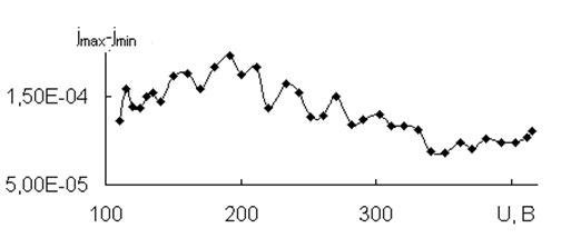 На залежностях струму від часу, знятих в області напруг, які відповідають ділянці 1 ВАХ, величина струму від часу не залежить і коливань не спостерігається, наприклад, часова залежність при 50 В (пряма лінія на рис.4.2). При прикладанні напруг, що відповідають ділянці 2 ВАХ, можна бачити процес появи коливань. Спочатку при досягненні порогової напруги виникають майже синусоїдальні коливання (синусоїда на рис. 4.2, відповідає напрузі 60 В). Потім із ростом напруги плавно зростає амплітуда коливань струму, з’являються синусоїдальні коливання з іншою частотою, як це видно з часових залежностей для 70 і 80 В на рис.4.2. Таким чином форма коливань змінюється від синусоїдального моногармонічного коливання (із частотою »1,75 Гц) до полігармонічного (i, можливо, навіть проявляється стохастичність коливального процесу), при цьому основна частота коливань зростає. Амплітуда коливань струму плавно зростає до 20 % від середньої величини струму. В області напруг, які відповідають ділянці 3 ВАХ, форма й частота коливань струму практично не змінюються з ростом напруги. Характерний вигляд коливань у цій області напруг демонструє часова залежність для 150 В (рис.4.2). Амплітуда ж коливань, проходячи через максимум при 200 В, із ростом напруги навіть дещо зменшується, як це видно з рис.4.3, де для кожної часової залежності було знайдено різниця між максимальною та мінімальною густиною струму.