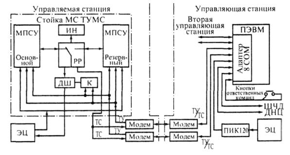 Аппаратура управляемой станции. В состав аппаратуры входят: два комплекта МПСУ (основной и резервный); релейный дешифратор команд управления ДШ; комплект реле для автоматического переключения на резерв РР; устройство блокировки команд управления К; панель индикации ИН: два изолированных от ЭЦ источника питания постоянного тока напряжением 24 В, используемые для питания перечисленных выше реле и цепей ввода информации с ЭЦ, а также изолирующий трансформатор и фильтр для питающего напряжения переменного тока 220 В (на схеме не показаны).
