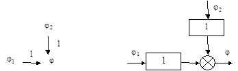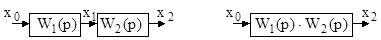В схеме можно выделить три характерных соединения элементов: последовательное, параллельное, и обратное (в виде отрицательной либо положительной обратной связи). Группа последовательно соединенных элементов структурной схемы при условии, что между элементами нет сумматоров и ответвлений сигнала, может быть заменена одним элементом с передаточной функцией, равной произведению передаточных функций всех элементов: