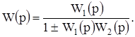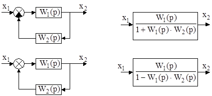 Если сигнал с выхода элемента обратной связи вычитается из сигнала, поступающего на вход элемента прямой цепи, то обратная связь является отрицательной, а если прибавляется – положительной. Такую пару элементов можно заменить одним элементом с передаточной функцией, равной дроби, числитель которой представляет собой передаточную функцию элемента прямой цепи, а знаменатель - произведение передаточных функций элементов прямой цепи и обратной связи со знаком плюс, если обратная связь отрицательная, или со знаком минус, если обратная связь положительная, увеличенное на единицу: