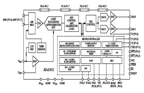ADuC812 - интегральная 12-разрядная система сбора информации, включающая в себя прецизионный многоканальный АЦП с самокалибровкой, два 12-разрядных ЦАП и программируемое 8-битное микропроцессорное ядро (совместимое с 8051, MCU). MCU поддерживается внутренними 8К FLASH ЭРПЗУ программ, 640 байт ЭРПЗУ памяти данных и 256 байт статической памяти данных с произвольной выборкой (RAM).