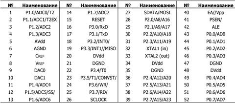 В таблице 2.1 приведено расположение контактов контроллера ADuC812.