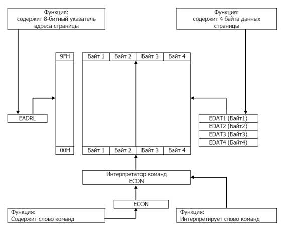 Память данных пользователя состоит из 640 байт, которые составляют 160 (от 00Н до 9FН) четырехбайтовых страниц, как показано на рисунке 2.3. Как и для прочей периферии, доступ к этой памяти производится через SFR регистры. Группа из 4-х регистров (EDATA1-4) используется для хранения данных четырех байт страницы из последнего обращения. EADRL используется для хранения адреса страницы, куда будет осуществляться доступ. И, наконец, ECON – 8-разрядный регистр управления, в который записывается одна из пяти команд управления доступом к памяти, допускающие различные операции чтения, записи, стирания и верификации. Блок-схема регистрового интерфейса к памяти показана на рисунке 2.4.