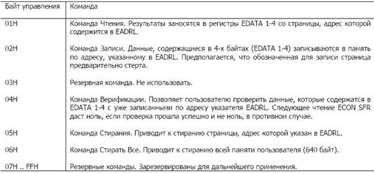 Для управления памятью используется регистр ECON, который является интерпретатором команд и в него можно записать одну из пяти чтения, программирования и стирания, как указано в таблице 2.2.