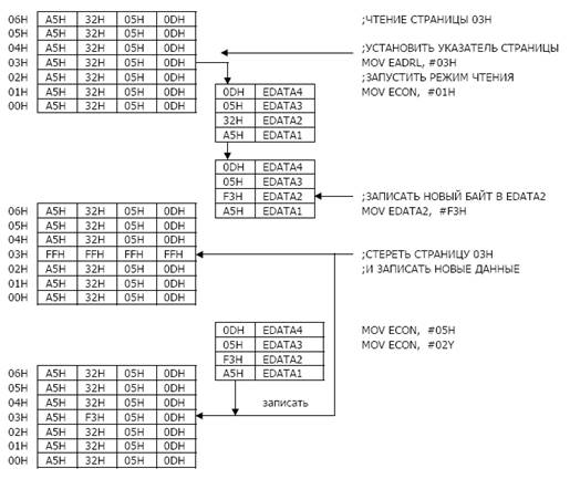 MOV EADRL, #03H ;Установка указателя страницы MOV ECON, #01H ;Команда чтения страницы MOV EDATA2, #0F3H ;Запись нового байта MOV ECON, #02H ;Команда стирания страницы MOV ECON, #05H ;Команда программирования страницы
