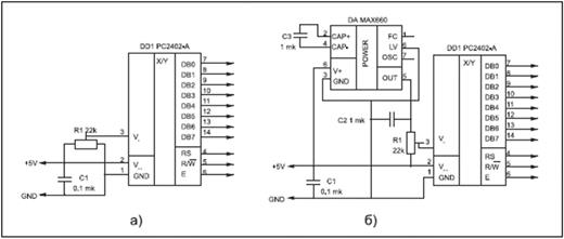 На начальном этапе необходимо подать питание на ЖКИ-модуль и добиться от него признаков работоспособности. Схема включения модуля, рассчитанного на стандартный диапазон температур, показана на рисунке 2.13а. Построечный резистор R1 позволяет плавно менять напряжение питания драйвера ЖКИ, что приводит к изменению угла поворота жидких кристаллов. Этим резистором можно отрегулировать фактическую контрастность при некотором преимущественном угле наблюдения (снизу-вверх или сверху-вниз).К сожалению, включение в данную схему ЖКИ-модуля, рассчитанного на расширенный диапазон температур, не приведет к успеху, так как из-за особенностей применяемых в них ЖК-материалов, эти ЖКИ требуют повышенного напряжения питания и при питании напряжением 5В изображение либо будет отсутствовать совсем, либо будет слабоконтрастным. Для преодоления ситуации необходимо подать на вывод V0 отрицательное напряжение (напряжение на ЖКИ определяется разностью Vcc и V0 ), составляющее в предельном случае – 5В. Если в схеме отсутствует источник отрицательного напряжения, то не составляет труда собрать простейший преобразователь, например, по схеме на рисунке 2.13.