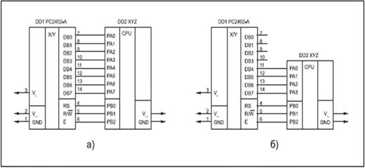 Нa рисунке 2.15а приведена схема подключения ЖКИ-модуля с 8-ми разрядной шиной к некоторой абстрактной микро-ЭВМ XYZ. Эта микро-ЭВМ содержит два порта: 8-ми разрядный двунаправленный РАО…РА7, к которому подключена шина DBO...DB7 ЖКИ-модуля, и 3-х разрядный РВО...РВ2, к которому подключены линии управляющих сигналов: Е, RS,R/W. На рисунке 2.15б можно видеть схему подключения ЖКИ-модуля к этой же микро-ЭВМ в 4-х разрядном режиме. Обратите внимание, что для обмена в 4-х разрядном режиме используется старшая тетрада шины данных – DB4...DB7.