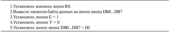 Описанные выше операции записи/чтения байта являются базовыми для осуществления обмена с ЖКИ-модулем. Реализация этих двух операций – единственное, что отличает процесс обмена по 8-ми разрядной шине от обмена по 4-х разрядной шине. Нa основе этих двух операций, реализованных программно (когда модуль подключен к портам микро-ЭВМ), или аппаратно (когда модуль подключен к системной шине), строятся все виды операций программирования и управления.