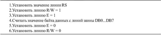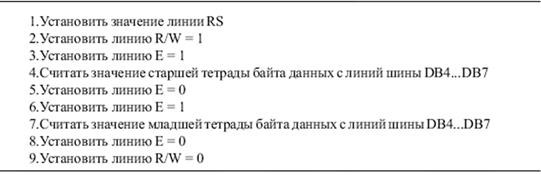 В соответствии с временной диаграммой (рис. 2.16 и 2.17) в исходном состоянии сигнал Е = 0, сигнал R/W = 0, значение сигнала RS – произвольное, шина данных DBO...DB7 в состоянии высокого импеданса (HI). Такое состояние управляющих сигналов (Е и R/W) должно поддерживаться все время в промежутках между операциями обмена с ЖКИ-модулем. Шина данных в эти моменты в принципе свободна, и может использоваться в мультиплексном режиме для каких-либо других целей, например, для сканирования матрицы клавиатуры. Естественно, необходимо позаботиться об исключении конфликтов на шине данных в момент совершения операций обмена с ЖКИ-модулем.