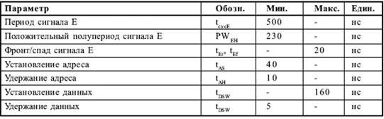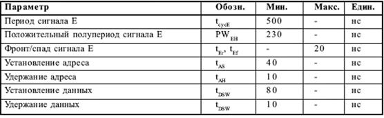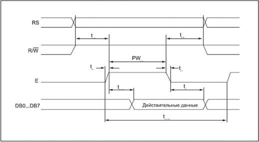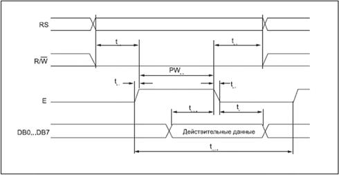 Другой вариант – очень простой путь – обмен с ЖКИ-модулем выполняется чисто программными средствами, через порты ввода-вывода управляющей микро-ЭВМ. В дальнейшем мы сконцентрируем внимание именно на этом варианте, так как он позволяет рассмотреть общий случай, абстрагируясь от конкретной системы. Вариант соединения с системной шиной, напротив, требует рассмотрения конкретных устройств, поэтому в случае необходимости можно рекомендовать изучить временные диаграммы операций чтения и записи, приведенные на рисунках 2.16 и 2.17, а также значения временных параметров, приведенные в таблицах 2.13 и 2.14 и сконструировать соответствующие управляющие схемы.