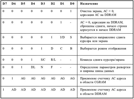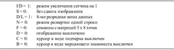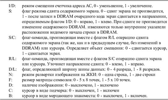 У контроллера HD44780 существует набор внутренних флагов, определяющих режимы работы различных элементов контроллера (таблица 2.17). В таблице 2.18 приведены значения управляющих флагов непосредственно после подачи на ЖКИ-модуль напряжения питания. Переопределение значений флагов производится специальными командами, записываемыми в регистр IR, при этом комбинации старших битов определяют группу флагов или команду, а младшие содержат собственно флаг.