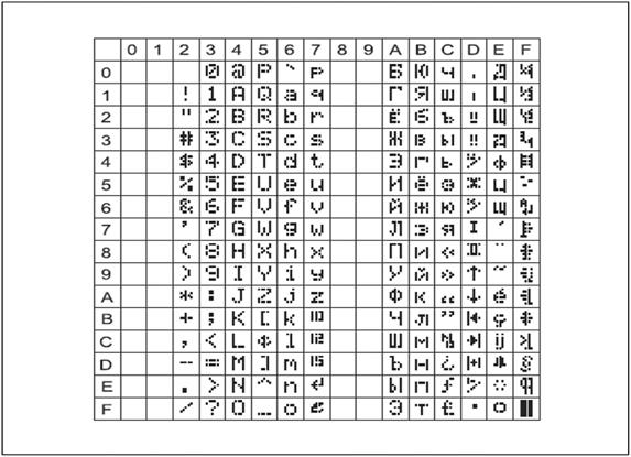 Контроллер HD44780 поддерживает как операции записи так и операции чтения. Чтение регистра DR приводит к загрузке содержимого DDRAM или CGRAM, в зависимости от текущего режима, при этом курсор смещается на одну позицию, как и при записи. Чтение регистра IR возвращает 8 значащих разрядов, причем в 7-ми младших содержится текущее значение счетчика АС (7 разрядов, если адресуется DDRAM, и 6 -если CGRAM), а в старшем – флаг занятости BF. Этот флаг имеет значение 1 когда контроллер занят и 0 – когда свободен. Необходимо учитывать, что большинство операций, выполняемых контроллером, занимают значительное время, около 40 мкс, а время выполнения некоторых доходит до единиц миллисекунд, поэтому цикл ожидания снятия флага BF должен обязательно присутствовать в программах драйвера ЖКИ-модуля и предшествовать совершению любой операции (естественно, кроме операции проверки флага BF), поэтому он весьма удобен для отечественных применений. Это свойство контроллеров фирмы Epson обеспечило им заслуженную популярность на российском рынке, поэтому в последнее время основная масса импортируемых в нашу страну ЖКИ-модулей оснащены именно этим контроллером; в качестве примера в таблице 2.20 приведен набор символов этого контролера.
