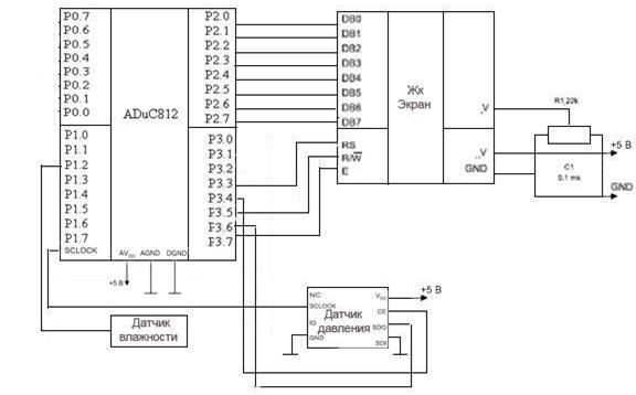 На рисунке 3.1 представлена функциональная схема СУ датчиками влажности и давления. Её принципиальное отличие от структурной схемы, представленной ранее, заключается в том, что на данном этапе уже выбран микроконтроллер,датчики и Жк дисплей