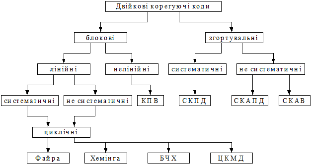 Корегуючі коди – це такі коди, в які формуються на основі інформаційної послідовності символів а1 ,а2 ... ак послідовність перевірочних символів в1 , в2 ... вr . в кодері. За допомогою введеної збитковості декодер має можливість в залежності від вибраного коду і алгоритму декодування, виявляти чи виправляти помилково прийняті інформаційні символи, які створені в результаті дії різного роду перешкод в каналі зв’язку.