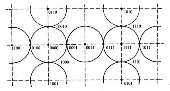 На рисунку 1 приведена геометрична модель найпростішого коригувального коду (4, 3) з парним числом одиниць, представлена на площині, де всі дозволені КК зображені у виді крапок, що є центрами окружностей з радіусами d = 1. Заборонені КК відображені крапками на окружностях, що завжди є загальними для двох суміжних окружностей.