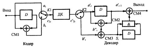 надходять на вхід кодера-декодера (КД), схема якого збігається зі схемою кодера на передавальному кінці ДК. У результаті на виході суматора СМ2 утворюється послідовність