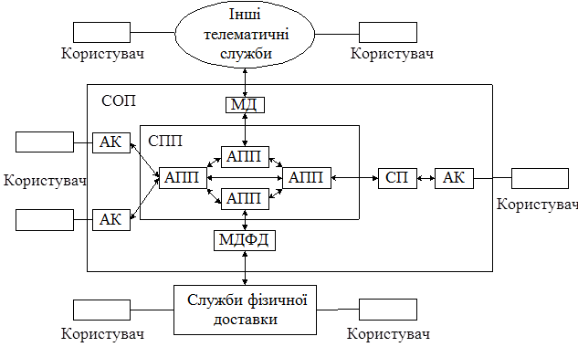 2) система передачі повідомлень (СПП) - забезпечує транспортування повідомлень усіх видів від АК відправника до АК одержувача. СПП містить ресурси для проміжного збереження повідомлень;