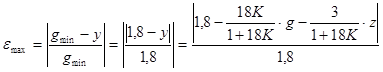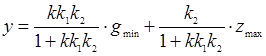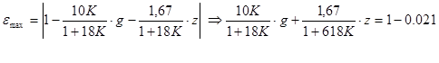 Подставляя значение y из выражения (3) в выражение (1) и решая полученное уравнение относительно K , входящего в выражения для Kg и Kz , определяют коэффициент усиления САУ (рис.1), при котором суммарная статическая ошибка ε не превышает заданного значения.