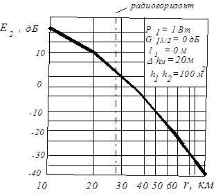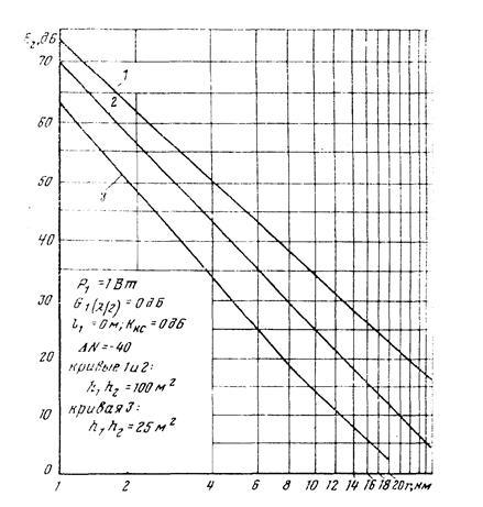 Дальность связи можно определить и без построения графика уровня сигнала вдоль перегона. Для этого из формулы (2.4) нужно определить значение напряженности поля Е 2 при u2 = u 2 мин ; затем по графику (рис.2.1) или по табл. П.3.1 находится расстояние, которое и будет являться дальностью связи.