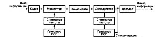 Второй часто используемый метод широкополосной передачи основан на псевдослучайной перестройке рабочей частоты сигнала (ППРЧ). Укрупненная функциональная схема (модель) цифровой системы связи с ППРЧ приведена на рис. 2