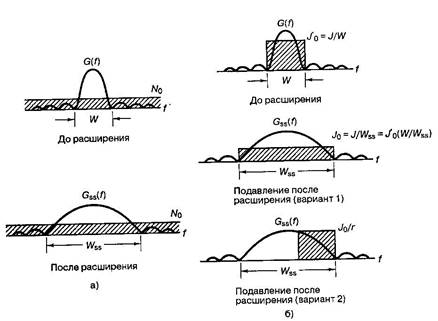 Сопротивляемость широкополосных систем связи помехам рассмотрим при воздействии белого шума и преднамеренных помех (рис. 3). Пусть G(f) - спектральная плотность мощности сигнала до расширения, а Gss (f) - после расширения (рис.3 а). Как видно из рисунка, односторонняя спектральная плотность мощности белого шума Nо не изменяется при расширении полосы сигнала с W до Wss . Следовательно, расширение спектра не улучшает качества связи при наличии белого гауссовского шума.