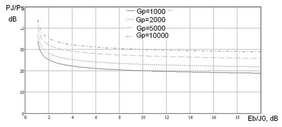 В общем случае мощность станции преднамеренных помех значительно выше мощности теплового шума. Поэтому суммарную величину отношения сигнал/шум можно считать равной Eb /J0 , подразумевая при этом отношение энергии бита данных к спектральной плотности мощности преднамеренной помехи, которое обеспечивает поддержание заданного уровня вероятности ошибок в канале связи.