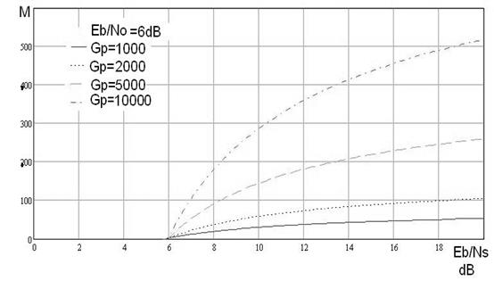 Зависимость числа одновременно действующих каналов М ШПСС от значения отношения сигнал/шум Eb /N0 приведено на рис. 5. Минимально допустимое значение отношения сигнал/помеха, при котором обеспечивается требуемое качество приема информации Eb /NΣ = Eb /N0 =6 дБ.