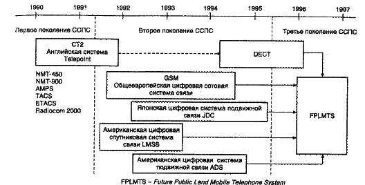 Дальнейшее развитие сотовой подвижной связи осуществляется в рамках создания проектов систем третьего поколения, которые будут отличаться унифицированной системой радио доступа, объединяющей существующие сотовые и “бес шнуровые” системы с информационными службами XXI в. Они будут иметь архитектуру единой сети и предоставлять связь абонентам в различных условиях, включая движущийся транспорт, жилые помещения, офисы и т. д. В Европе такая концепция, получившая название UMTS (универсальная система подвижной связи), предусматривает объединение функциональных возможностей существующих цифровых систем связи в единую систему третьего поколения FPLMTS (Future Public Land Mobile Telephone System) с предоставлением абонентам стандартизированных услуг подвижной связи. Работы по созданию международной системы подвижной связи общего пользования FPLMTS ведутся Международным союзом электросвязи. Для нее определен диапазон частот 1 - 3 ГГц, в котором будут выделены полосы шириной 60 МГц для стационарных станций и 170 МГц - для подвижных станций. Начало испытаний наземных компонентов системы ожидается в 2000 г., а ввод спутниковой подсистемы FPLMTS в полосах частот 1980-2010 и 2170-2200 МГц - в 2010 г.