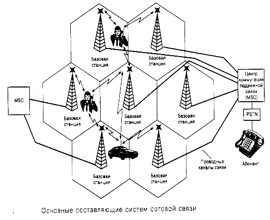 Все базовые станции соединены с центром коммутации подвижной связи (коммутатором) по выделенным проводным или радиорелейным каналам связи (рис 1). Центр коммутации MSC — это автоматическая телефонная станция системы сотовой связи, обеспечивающая все функции управления сетью.
