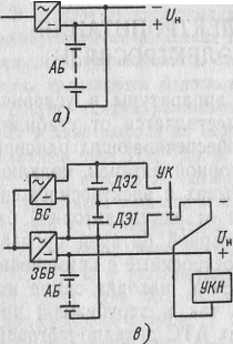 В системе электропитания с отделенной от нагрузки резервной аккумуляторной батареей (рисунок 2, а) при нормальном электроснабжении питание аппаратуры связи осуществляется от стабилизирующего выпрямителя БВ, а АБ находится в режиме непрерывного подзаряда от дополнительного зарядного выпрямителя 3В и отключена от нагрузки тиристором VS. При пропадании сети переменного тока или аварии в БВ тиристор VSподключает АБ к нагрузке без перерыва в питании аппаратуры. Послеаварийный заряд АБ осуществляется при ее отключении от нагрузки, что дает возможность исключить из состава ЭПУ устройства регулирования напряжения, т. е. существенно упростить ЭПУ. Эта система применяется для питания аппаратуры, допускающей достаточно широкие пределы изменения питающего напряжения, например для АТС первого и второго поколений небольшой емкости (при выходной мощности ЭПУ до 2 кВт).