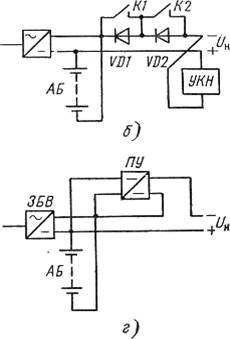 В схеме на рисунок 1,б предусматривается регулирование напряжения на нагрузке посредством закорачивания групп вентилей VD1 и VD2 с помощью контакторов К1 и К2, управляемых устройством контроля напряжения. В условиях нормального электроснабжения контакты контакторов К,1 и К2 разомкнуты. При разряде аккумуляторной батареи, по мере снижения напряжения контакторы К1 и К2 осуществляют поэтапное закорачивание групп вентилей. ЭПУ достаточно проста, но характеризуется низким КПД и может быть рекомендована при сравнительно небольших мощностях. ВСН 332—88 рекомендуют применять эту схему в ЭПУ ±«60 В» при нагрузках до 70 А и в ЭПУ —«24 В» —до 100 А.