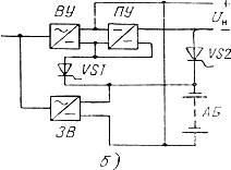 В ЭПУ, построенной по схеме на рисунок 2,б, стабилизация выходного напряжения при разряде АБ производится с помощью стабилизирующего преобразовательного устройства (вольтодобавочного) ПУ. Принципиально возможно стабилизировать выходное напряжение и при нестабилизирующем выпрямительном устройстве ВУ. При отключении электроснабжения или аварии в ВУ включается тиристор VS1 и питание аппаратуры осуществляется от разряжающейся АБ и ПУ при стабильном напряжении. Заряд и содержание АБ производится от зарядного выпрямителя 3В. Тиристор VS2 подключает АБ к нагрузке в случае понижения напряжения на ней, что может иметь место при переходных процессах в системе. Рассмотренная система выгодно отличается от буферной (рисунок 1, г) меньшими потерями энергии и большей перегрузочной способностью и может быть рекомендована для питания станций с программным управлением.