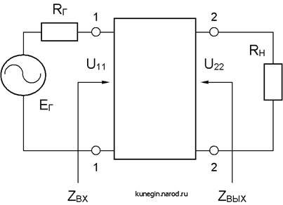 В этой схеме ко входу исследуемого объекта, например некоторого четырехполюсника, подключается генератор испытательного сигнала с полностью определенными параметрами, т.е. должно быть известно его выходное сопротивление RГ , развиваемая ЭДС EГ (или напряжение на входе объекта UВХ ). Входное сопротивление объекта RГ также должно быть известно. К выходу объекта подключается указатель уровня с входным сопротивлением, равным номинальному значению сопротивления нагрузки; реальная нагрузка при этом отключается.