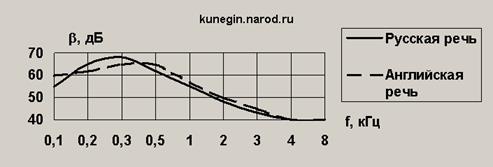 - порог слышимости (минимальное звуковое давление, которое начинает ощущаться человеком с нормальным слухом на частотах 600..800 Гц); f = 1 Гц. Из Рис.3.4 следует, что речь представляет собой широкополосный процесс, частотный спектр которого простирается от 50..100 Гц до 8000..10000 Гц. Установлено, однако, что качество речи получается вполне удовлетворительным при ограничении спектра частотами 300..3400 Гц. Эти частоты приняты МСЭ-Т в качестве границ эффективного спектра речи. При указанной полосе частот слоговая разборчивость составляет около 90%, разборчивость фраз - более 99% и сохраняется удовлетворительная натуральность звучания.