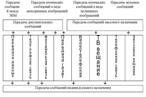 Условная классификация современных видов электросвязи показана на Рис. 3.6. Все виды электросвязи по типу передаваемых сообщений могут быть разделены на предназначенные для передачи звуковых сообщений, оптических сообщений в виде подвижных изображений, оптических сообщений в виде неподвижных изображений и сообщений между ЭВМ. В зависимости от назначения сообщений виды электросвязи могут быть разделены на предназначенные для передачи сообщений индивидуального и массового характера.