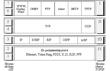 Так как стек TCP/IP был разработан до появления модели взаимодействия открытых систем ISO/OSI, то, хотя он также имеет многоуровневую структуру, соответствие уровней стека TCP/IP уровням модели OSI достаточно условно.