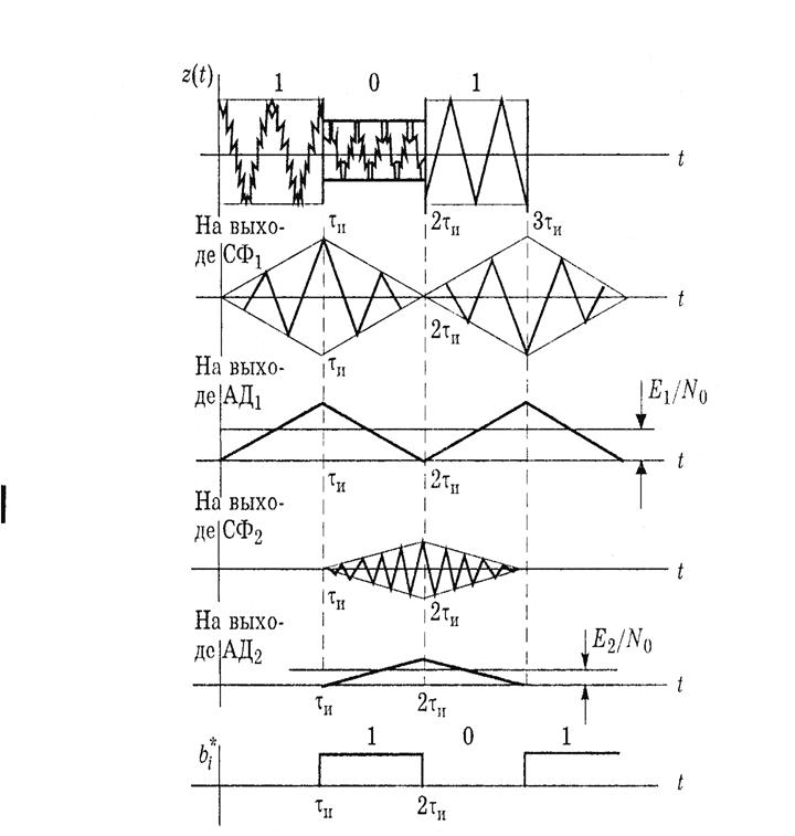 В результате такого преобразования мы сами искажаем сигнал, так как приближаем его к уровню квантования .Для уменьшения этих искажений применяется нелинейная шкала квантования . С выхода кодера двоичный ИКМ сигнал поступает на модулятор, где происходит образование ЧМ сигнала. В модулятор подаются два гармонических сигнала с разными частотами. В первом перемножителе происходит перемножение первого гармонического сигнала с информационным сигналом, во втором перемножение второго гармонического сигнала и инверсией информационного. В сумматоре происходит сложение результатов перемножений. В итоге на выходе сумматора будет сигнал с частотой первого гармонического сигнала там где был единичный уровень информационного сигнала, и частота второго гармонического сигнала, там где был единичный уровень инверсии информационного сигнала. Для ограничения спектра сигнала передаваемого в канал на выходе передатчика ставится полосовой фильтр. Далее сигнал поступает в линию, где на него влияют помехи и вместе с помехами сигнал приходит на демодулятор, состоящий из ПФ ( ограничивает спектр принимаемого сигнала), АД (амплитудные детекторы), которые выделяют огибающую сигнала, в разностном устройстве происходит вычитание сигналов полученных на выходе амплитудных детекторов. Далее если напряжение на выходе ФНЧ пересекает заранее заданный положительный пороговый уровень, то на выходе решающего устройства формируется единичный