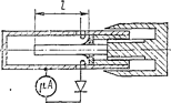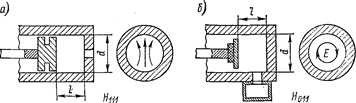 Резонансный частотомер с объемным резонатором настраивается передвижением подвижного поршня (плунжера). Возбуждаемые внутри полости резонатора стоячие волны бывают различных типов. Это зависит от способа введения возбуждающего электромагнитного поля. При возбуждении цилиндрического резонатора через отверстие в центре торцевой стенки (рис. 8, а) возникают колебания типа H111 . Из электродинамики известно, что собственная длина волны, в резонаторе связана с его диаметром а и высотой I следующей зависимостью: