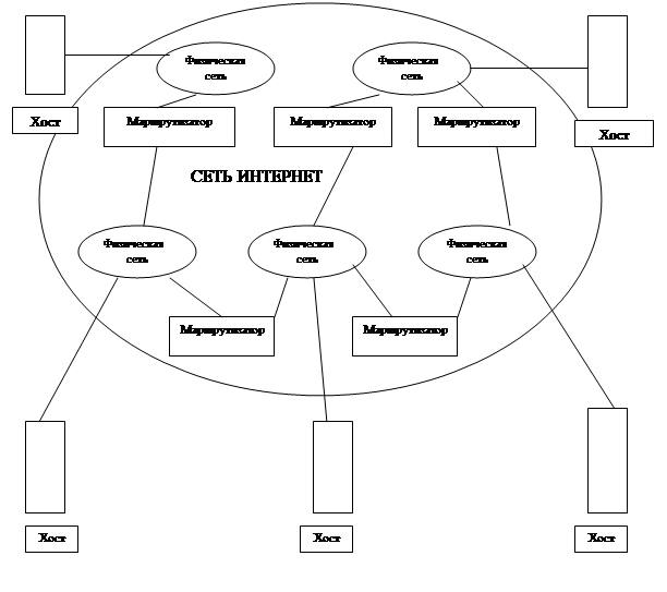 Сіть Інтернет приховує деталі з'єднань сітей між собою, тому з погляду кінцевих користувачів і по відношенню до прикладних програм сіть Інтернет є єдиною віртуальною сіттю, до якої приєднані всі комп'ютери – незалежно від їх реальних фізичних з'єднань (мал. 1). Кожний комп'ютер повинен мати програмне забезпечення доступу до сіті Інтернет, яке дозволяє прикладним програмам використовувати сіть Інтернет як одну фізичну сіть.