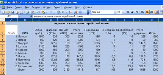 В ячейку J3 введена формула для вычисления "Итого удержано": =G3+H3+I3.