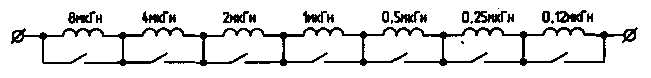 Для нормальной работы этой ЦС необходима плавная регулировка индуктивности. Иногда даже половина витка имеет решающее значение для согласования. Это ограничивает использование индуктивности с отводами или требует индивидуального подбора количества витков для конкретной антенны. Необходимо, чтобы емкость С1 и С2 на "землю" была не более 25 пФ, в противном случае возможно снижение КПД на 24...28 МГц. Необходимо, чтобы "холодный" конец катушки L1 был тщательно заземлен. Данная ЦС обладает хорошими параметрами: КПД - до 80% при трансформации 75 Ом в 750 Ом, возможность согласования нагрузки от 10 Ом до нескольких килоом. С помощью только одной переменной индуктивности 30 мкГн можно перекрыть весь диапазон от 3,5 до 30 МГц, а подключив параллельно C1, C2 постоянные конденсаторы по 200 пФ, можно работать и на 1,8 МГц. К сожалению, переменная индуктивность дорога и сложна конструктивно. W3TS предложил переключаемую "цифровую индуктивность" (рис.8). Используя такую индуктивность, с помощью переключателей можно наглядно выставить нужное ее значение.