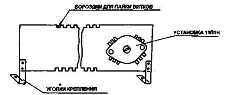 Катушку конструктивно удобно выполнить как показано на рис.10. Каркас ее представляет собой планку из двустороннего стеклотекстолита с пропилами под витки катушки. На этой планке установлен переключатель (например 11П1Н). Отводы от катушки идут к переключателю по обеим сторонам стеклотекстолитовой планки.