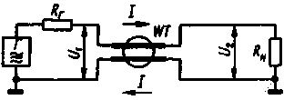 Когда длина линий для обмоток много меньше длины рабочей волны, ТДЛ могут быть упрощены: линии, где синфазные напряжения равны нулю. заменяют перемычкой. В этом случае, например, трехобмоточный ТДЛ (рис. 5, д) преобразуется в двухобмоточный (рис. 6).